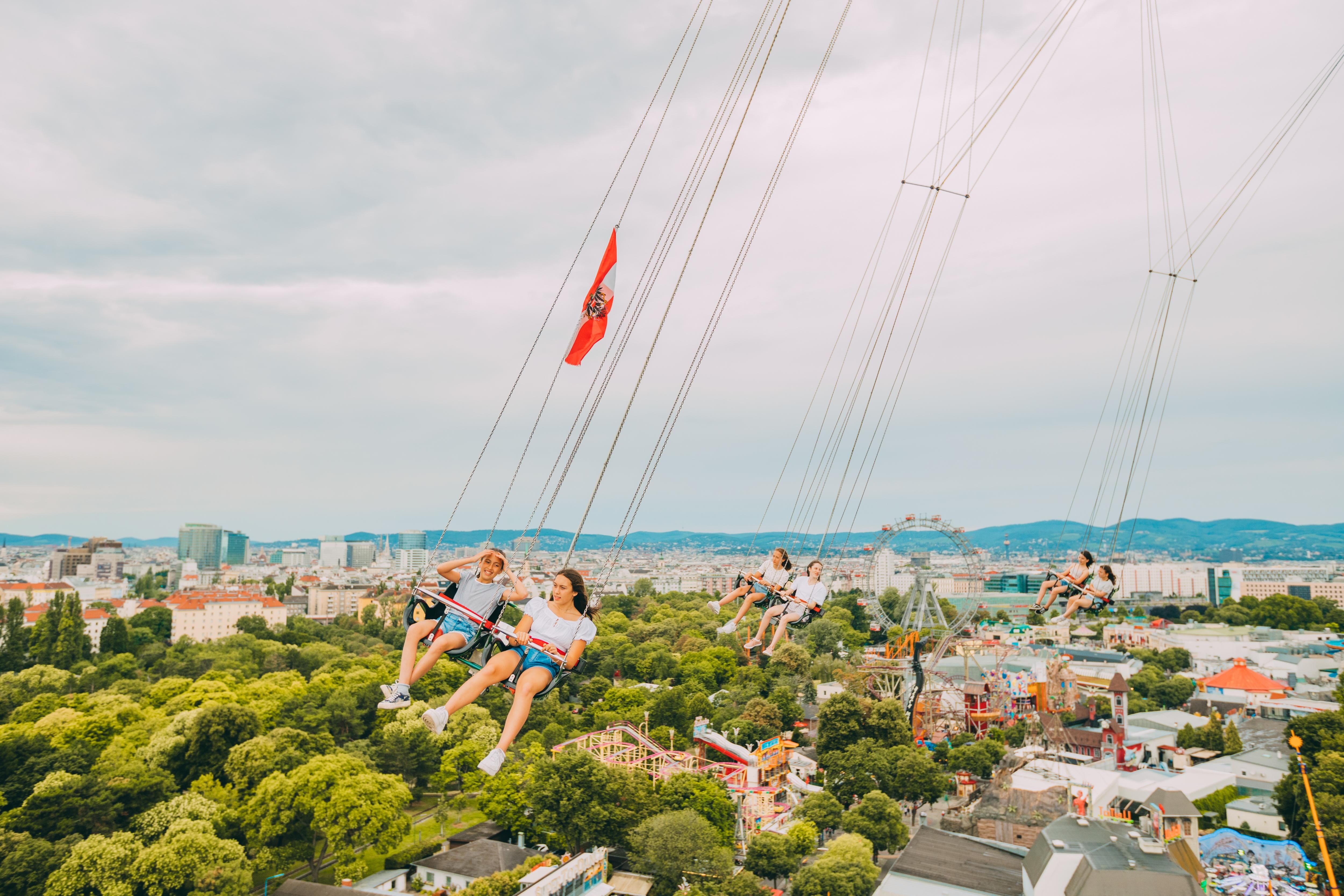 Der Prater Turm: In einer Höhe von 117 Metern im Doppelsitz im Kreis schwingen – nur für Schwindelfreie und ideal für Romantiker:innen!Die älteste Holzrutsche der Welt