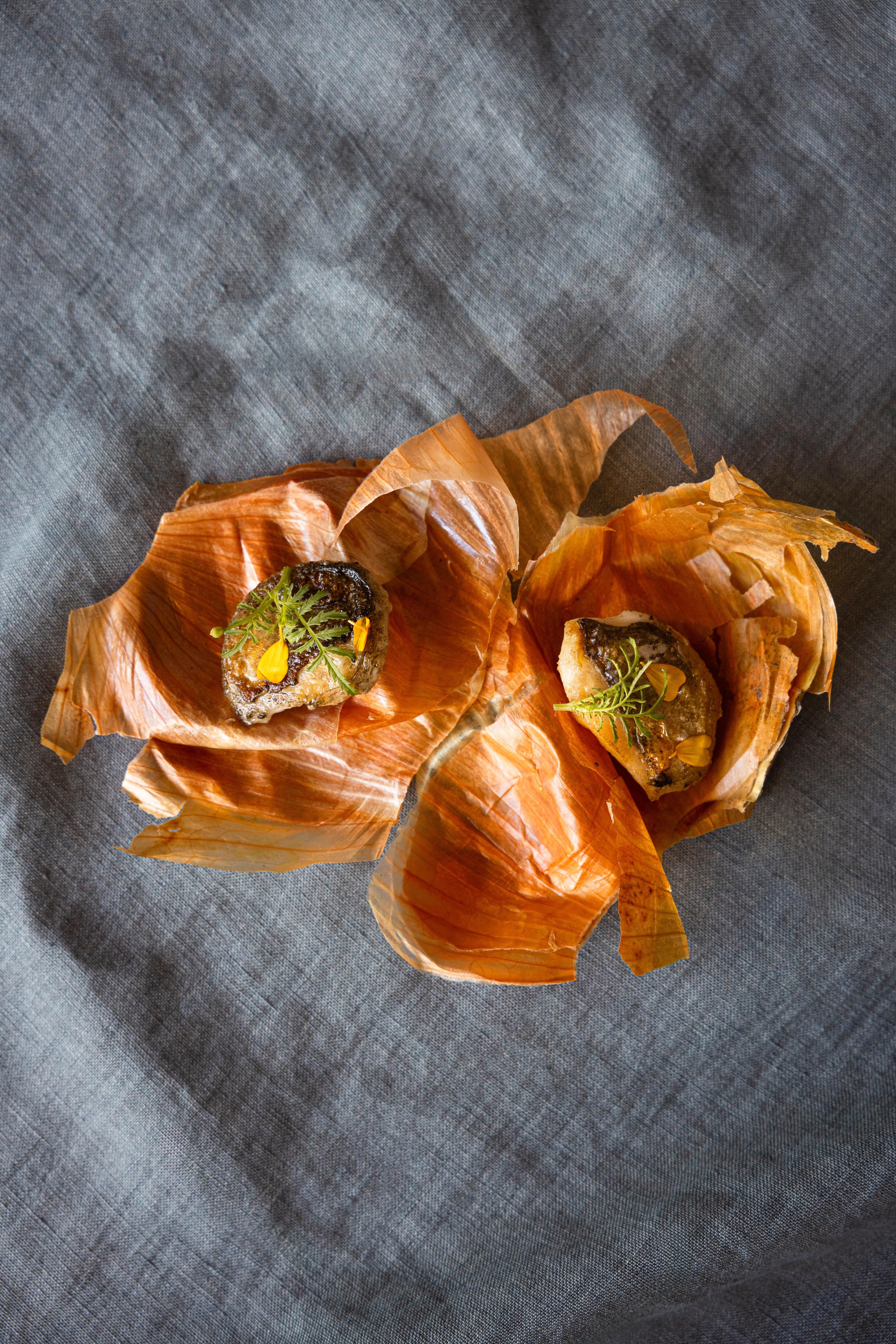 Zarte Zanderbackerl auf aromatischen Zwiebelschalen, verfeinert mit floralen Tagetes – ein eleganter Apéro-Happen, kreiert von Roman Pichler.