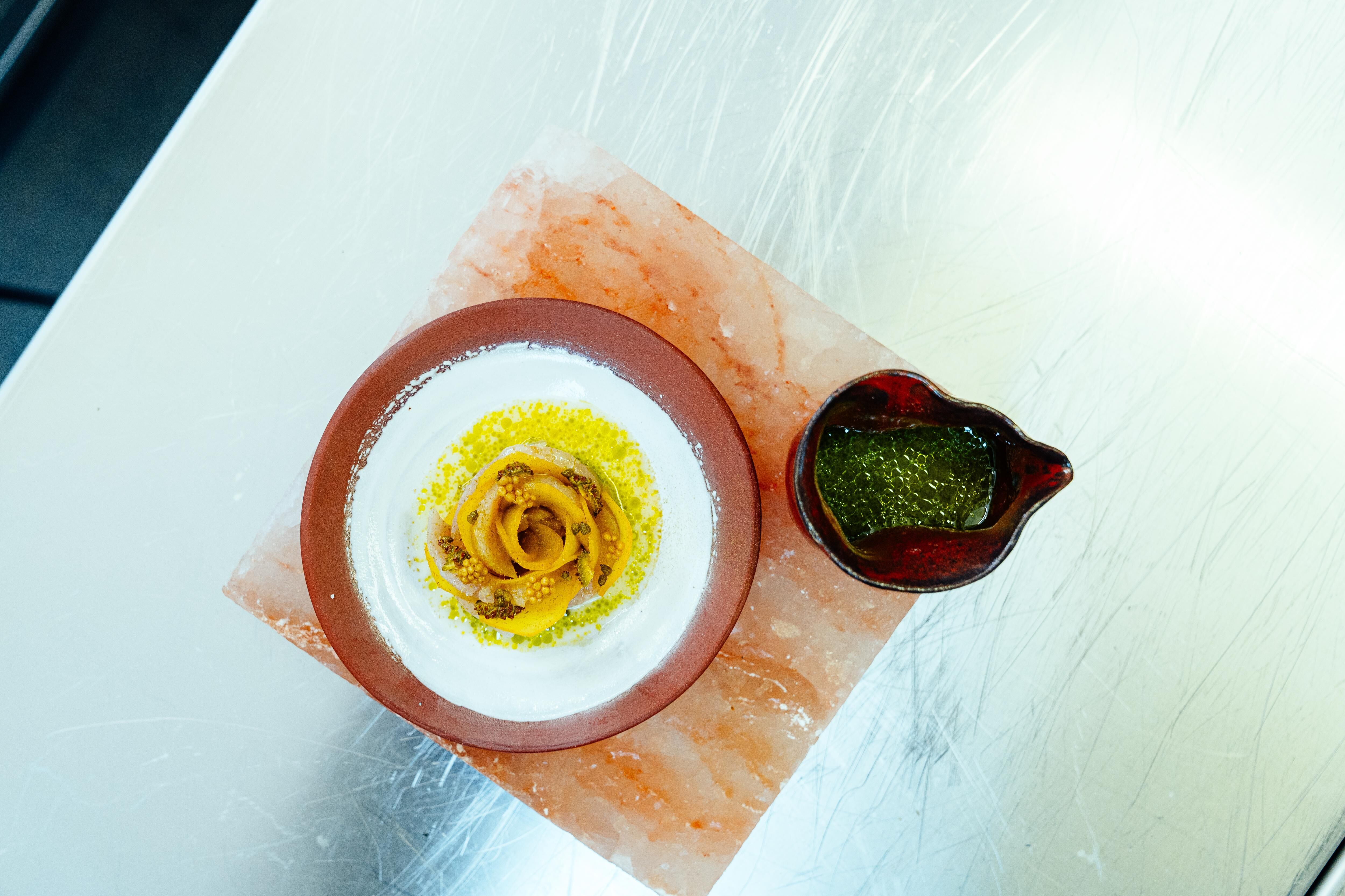 Ein außergewöhnliches Rezept für Probierfreudige: In Steinsalz gebeizter Kwellsaibling trifft auf alpine Aromen wie Latschenkiefer und fermentierte Quitte.