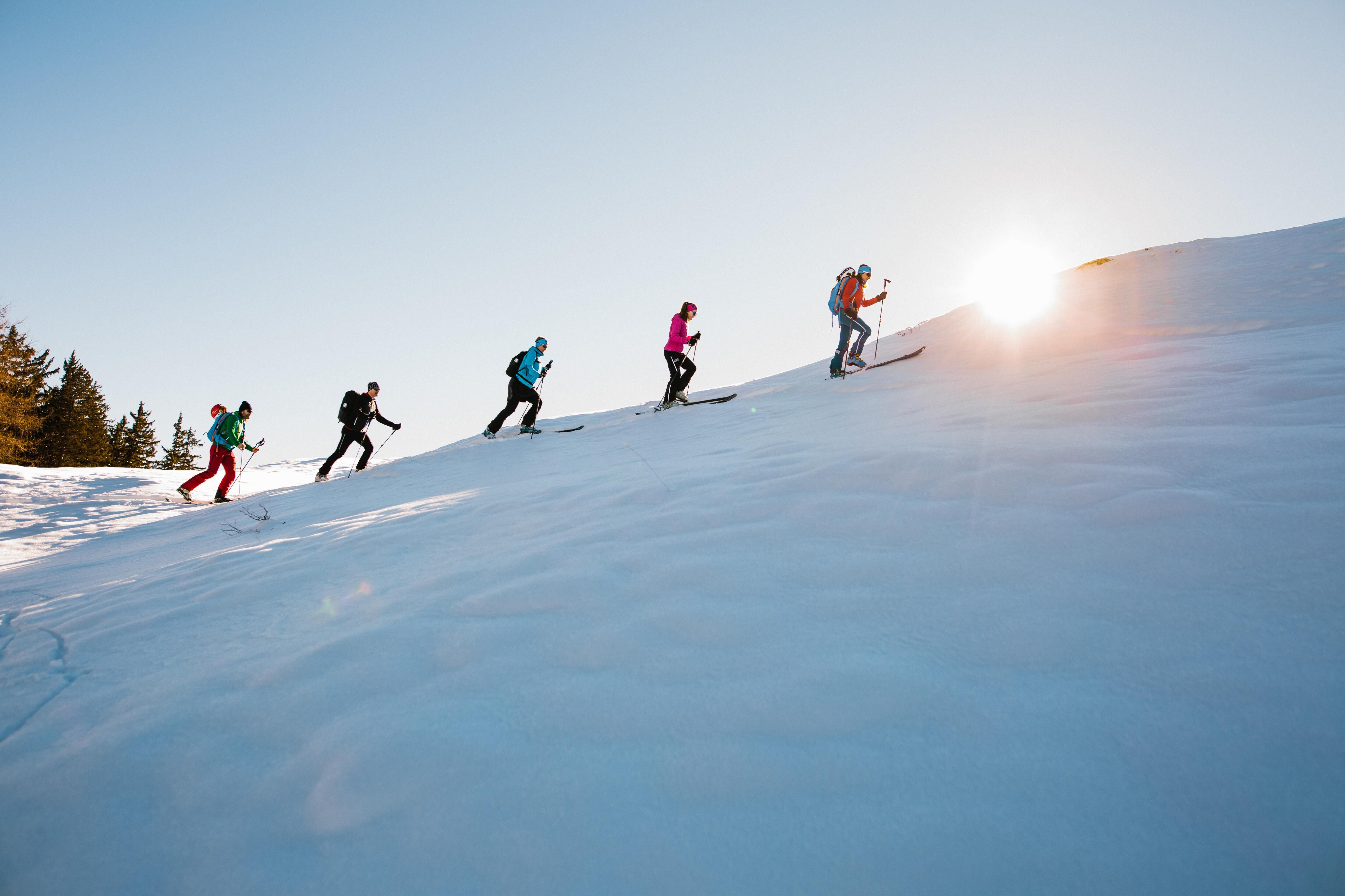Getting your ascent right is the biggest part of your enjoyment (or otherwise) of your ski touring day. Putting the skins on the bases of your skis correctly and setting your binding and boots in the accurate ways are all skills that need to be learned. Once you're underway on your ascent a common mistake for first timers is to lift your ski off the ground when skiing up, when it is much more efficient and saves energy if you slide your skis, keeping contact with the snow throughout.
